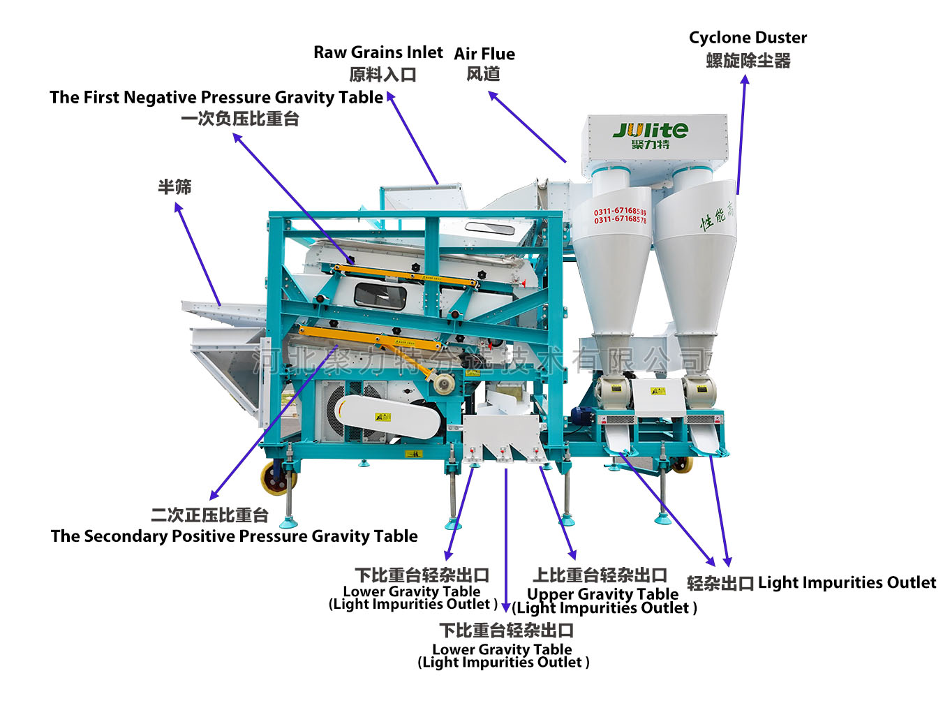 物料通過提升機(jī)經(jīng)喂入斗進(jìn)入第一道負(fù)壓比重臺(tái),通過風(fēng)選去除物料中的粉塵、糠殼等輕雜質(zhì),輕雜經(jīng)風(fēng)道、旋風(fēng)除塵器,由閉風(fēng)器排出;通過比重選有效去除物料中的秸稈、軸芯等比重較輕的雜質(zhì)。然后物料通過導(dǎo)糧機(jī)構(gòu)進(jìn)入第二道正壓比重臺(tái),通過調(diào)整風(fēng)量、擋板位置等進(jìn)行比重加工,去除物料中的碎粒、秕籽、芽粒、蟲蛀粒、霉變粒等雜質(zhì),最終成品從比重臺(tái)高處排出。